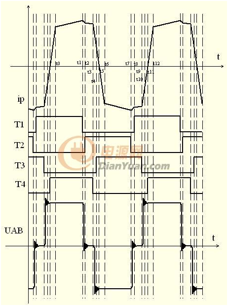 12個工作過程包括:2個正負半周期的功率輸出過程,2個正負半周期的鉗位續(xù)流過程,4個諧振過程(包括2個橋臂的諧振過程與2個換流過程),2個原邊電感儲能返回電網(wǎng)過程,最后還有2個變壓器原邊電流上沖或下沖過零結(jié)束急變過程。這12個過程就構(gòu)成了移相全橋的一個完整的工作周期,只要有任何一個過程發(fā)生偏離或異常,將會影響到移相全橋的ZVS效果,甚至會導(dǎo)致整個電源不能正常工作。