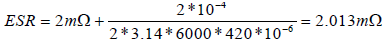 由于直流濾波電容上的紋波電流主要是2倍開(kāi)關(guān)頻率(6kHz)次諧波,因此可以計(jì)算得到電容的等效串聯(lián)電阻為: