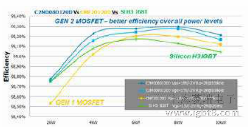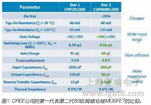 第一代和第二代80歐姆CREE MOSFET與最新代Si IGBT相比,碳化硅MOSFE可以由Ggs=15V/-2V驅動。