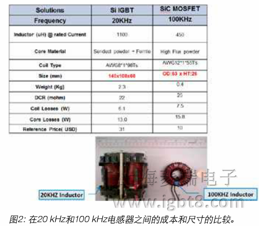 在Si-IGBT已經被切換為20 kHz。CREE MOSFET的開關頻率為100 kHz。很明顯,在Vgs=18V/-2V和Vgs=15V/-2V條件下,C2M0080120D比Si-IGBT實現(xiàn)了更好的效率。