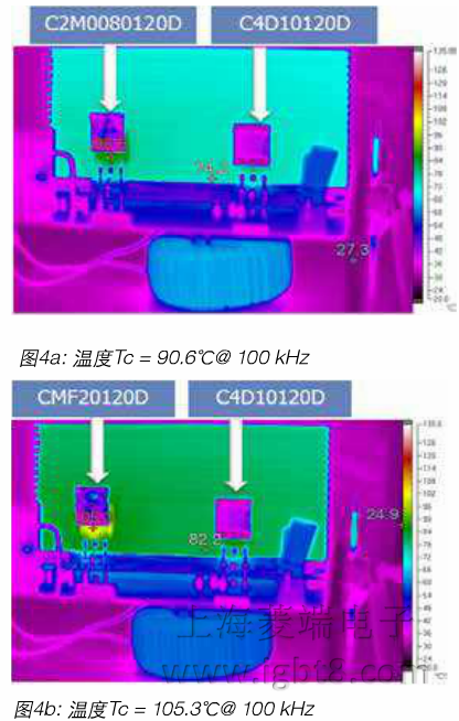 效率當然是客戶應用的個重要特征。由此造成的系統(tǒng)損耗和熱成像很重要,但是,更重要的是系統(tǒng)設計者。此外,通過熱成像儀記錄的熱成像可以在圖4a4c的圖像中看到。