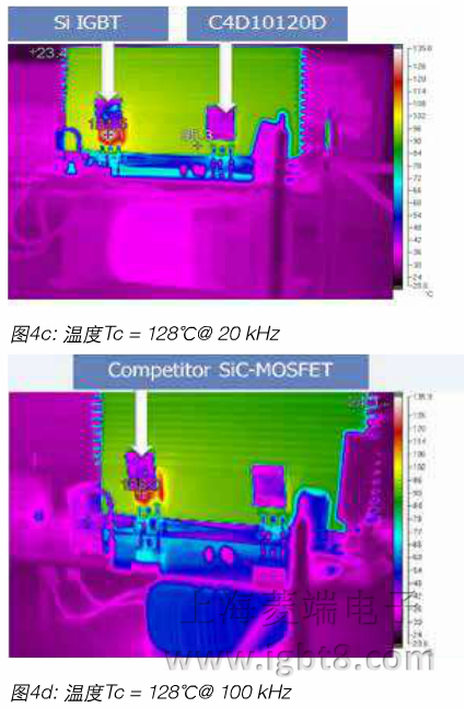 此外,在相同轉換器中比較了競爭者的SiC-MOSFET。在6d圖像中可以看出結果。C2M0080120D比CWIF20120D冷了15℃,比競爭對手的SiC-MOSFET冷了近38'C。實際上CMF20120D溫度低了約13C。