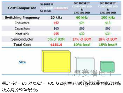 現(xiàn)在比較BOM時,下列事實可以成立.雖然功率半導體的百分比只有硅基解決方案的5%,但最終整體成本較高。其中一個原因是由于較高的頻率可以減少電感,另一個原因是開關損耗相當?shù),因此在SiC-MOSFET的情況下有更好的熱成像,從而有可能減少散熱器的大小和成本。如果開關頻率提高到f= 100 kHz,碳化硅基解決方案的BOM成本可以降低5%。顯著減少的整個系統(tǒng)的尺寸和重量也必須考慮在內。